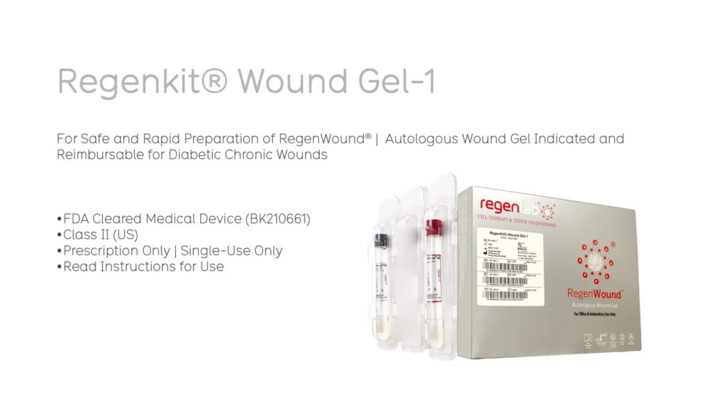 RegenKit®-Wound Gel-1 and RegenKit®-Wound Gel-2 are single-use devices intended for the rapid preparation of PRP gels at the patient’s bedside to enhance wound healing through re-epithelialization, revascularization, and granulation tissue formation.
